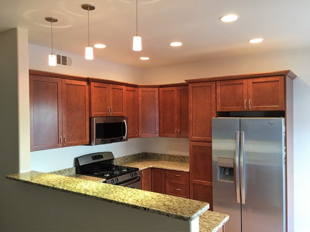 This kitchen is front and center when entering this efficient suburban condo. The couple wanted to have a warm, inviting space that blended with the living area. They are settled in now, cozy and happy. Design First Kitchen and Bath enjoys collaborating with Interior Designers, General Contractors and Remodelers as well as DIY’ers.